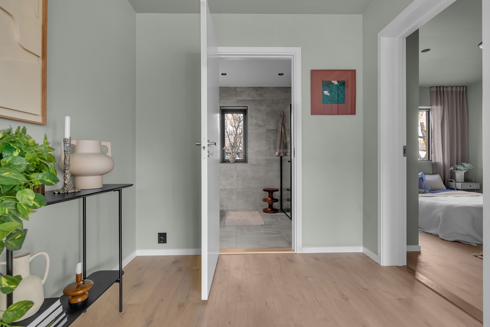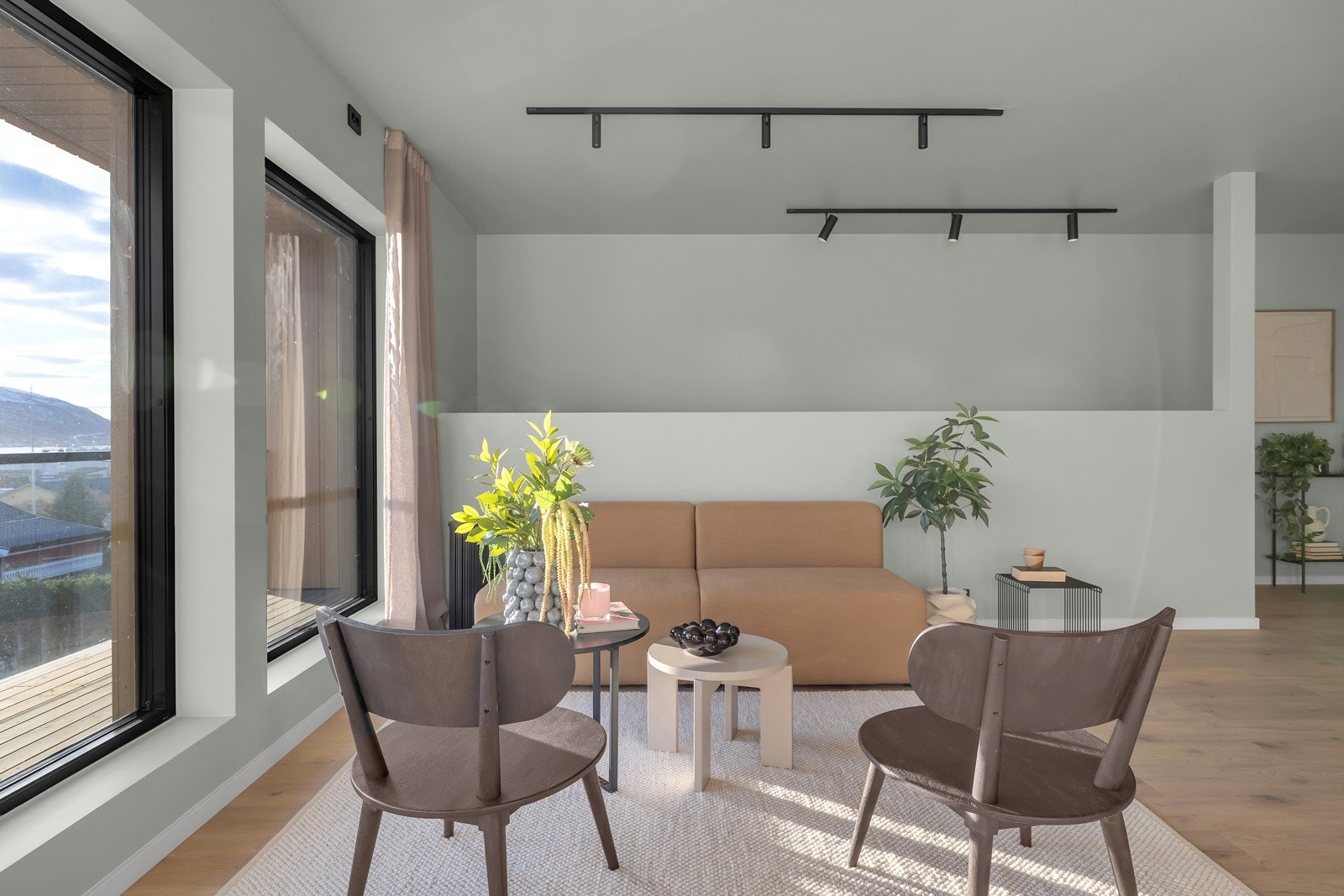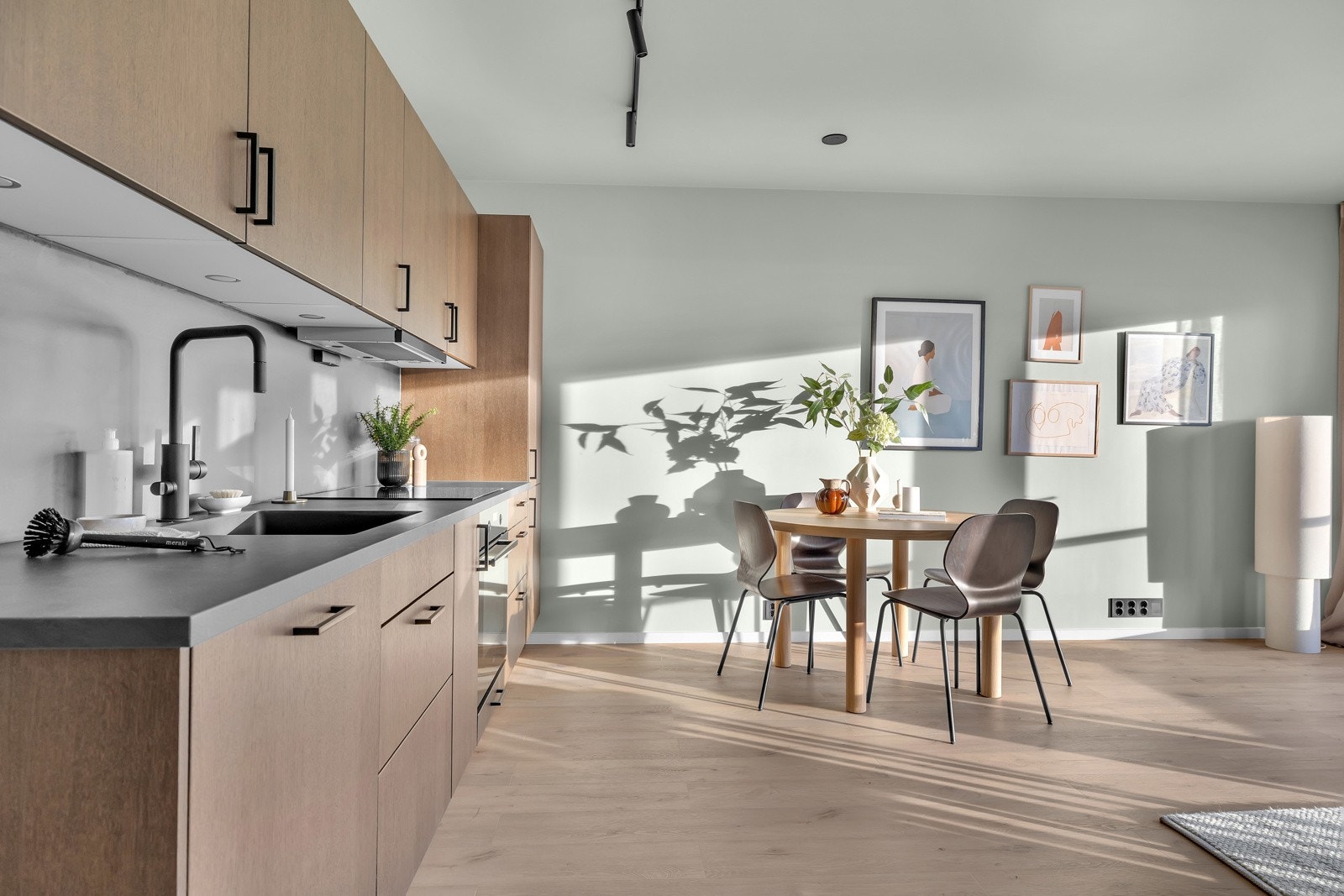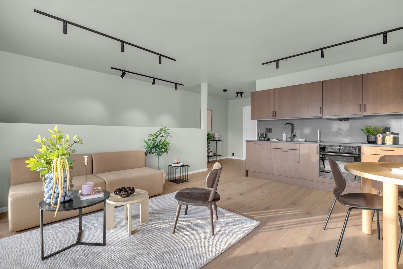 | Standard | Entre: fliser i stor format på gulv med varmekabler i første del av entre, Coretec klikkvinyl i resten av entre/gang, gips på vegger og himling, listefri himling, lakkert trap, downlights. Bod: gips himling og vegger, sikringsskap. Soverom: gips himling/ vegger, listefri himling og vinduskarmer. Kjøkken: downlights i himling, kjøkken fra Sigdal med integrerte hvitevarer. Stue: downlights i himling, gips himling/vegger, listefri himling/vinduskarmer, downlights i vindusforing. Bad: vegghengt toalett, dusjdører med armatur på vegg, 60x60cm fliser på vegger/gulv og mosaikk i dusjsone, gips himling, listefritt, innredning med skuffer, downlights i himling, varme i gulv, uttak for vaskemaskin. Alle gulv leveres av CoreTec klikkvenyl. 200L varmtvannstank. Balansert ventilasjon fra Flex-It. Klargjort for smarthusstyring av lys og oppvarming. Opplysninger er hentet fra leveransebeskrivelsen til selger. |