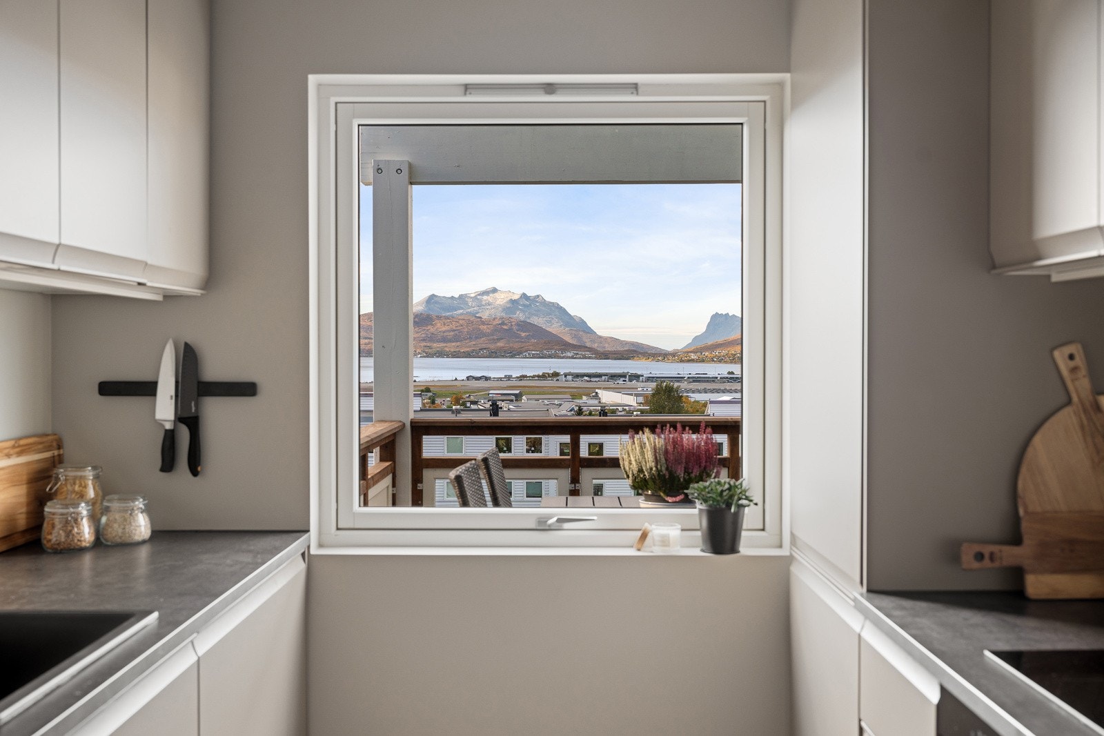 Beliggenhet | Winston Churchills veg 88, anr. 427 er en 2-roms borettslagsleilighet i toppetasjen på denne boligblokken i bydelen Håpet i Tromsø. Fra soverommet er det utgang til en vestvendt balkong med flott utsikt mot Kvaløya og Sandnessundet. Det er utendørs parkering på borettslagets eiendom, i tillegg til privat sportsbod i byggets underetasje. Det er nærhet til butikker, kjøpesenter, busstopp, treningssenter og flotte friområder, samt skole og barnehage. |