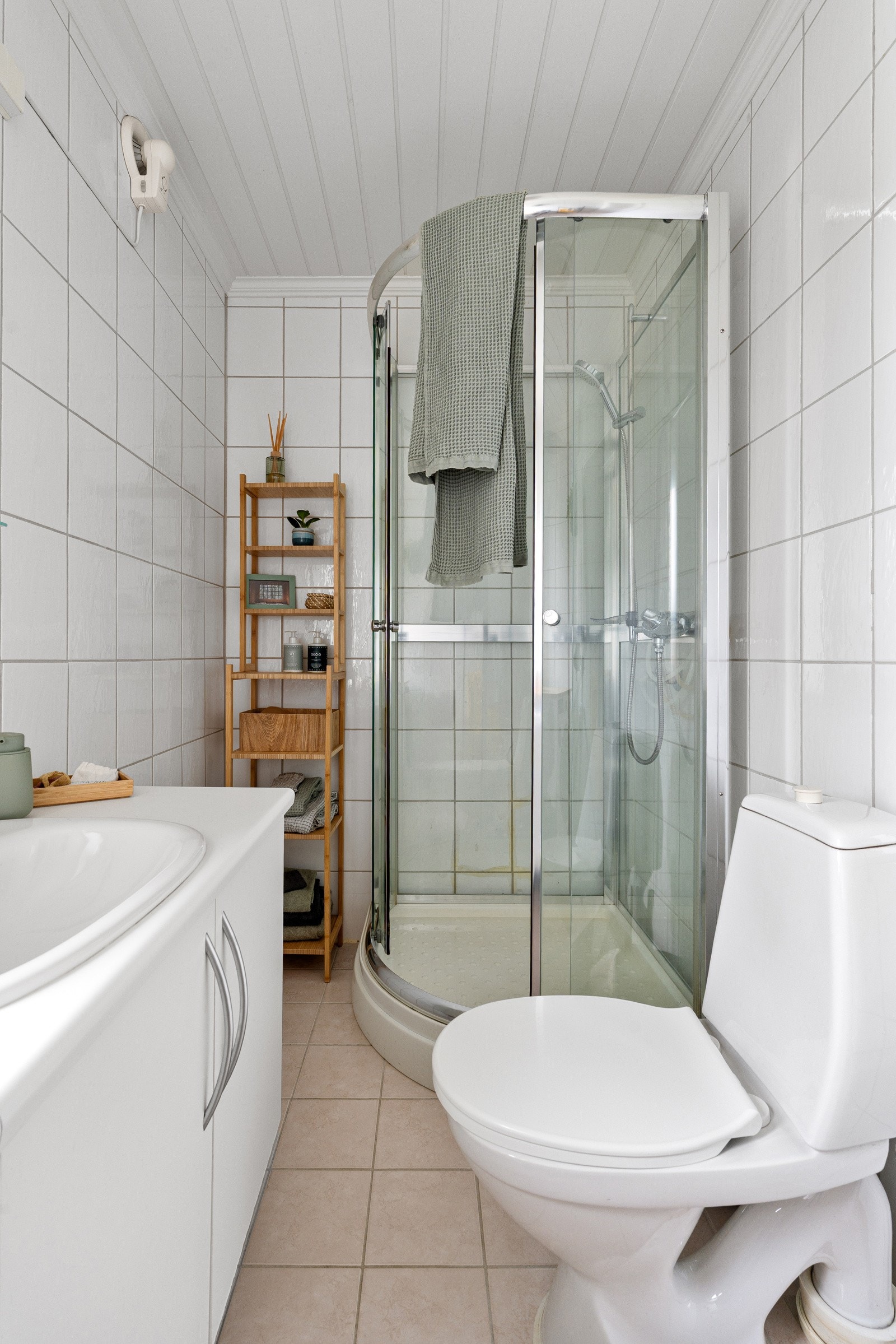 Standard | Innvendige overflater: Gulv: Laminat. Vegg: Malte flater/plater, malt panel. Himling: Malte plater, himlingsplater, malt panel. Det er påvist noe tørkesprekker, ellers fremstår innvendige overflater med normal forventbar aldersslitasje. Etasjeskiller er av trebjelkelag. Det er stedvis registrert litt knirk. Det er ikke målt høydeforskjell på alle gulvene da det er vanskelig å måle nøyaktig på grunn av møblering i rommene. Det er registrert høydeforskjell i etasjeskille på stue/soverom i hybeldel innenfor 2 meter på ca 15 mm og ca 27 mm gjennom hele rommet. Boligen ligger i 2. etasje, over kjeller og 1. etasje, og radonmålinger er ikke relevant. Innvendige hvite formpressede dører. Dørene fremstår med normal forventbar aldersslitasje. Felles kjeller med varmtvannstanker, stoppekran og opplegg til vaskemaskin. Kjøkken: Kjøkken hovedleilighet: Kjøkkenet har innredning med glatte fronter. Benkeplaten er av laminat. Det er opplegg til oppvaskmaskin og komfyr. Det er kjøkkenventilator med avtrekk ut. Kjøkken hybeldel: Overskap med glatte fronter, montert hybelkjøkken. kjøkkenventilator. Montert nytt hybelkjøkken og avtrekksvifte i 2022. Det er avtrekk via mekanisk avtrekksanlegg i boenheten. Våtrom: Dusj/wc/vaskerom: Aktuell byggeforskrift er tekniske forskrifter i perioden 1997-2010. Dokumentasjon: ingen dokumentasjon. Dusj/wc/vaskerom hovedleilighet: 1 dusjkabinett, 1 servant m/servantskap, 1 wc, opplegg til vaskemaskin. Fliser på gulv og vegger. Avtrekksvifte i vegg. et er motfall på ca 2 mm fra innenfor dørterskel til oppå slukrist. Veggfliser i hjørner er sprukket, det er løse fliser i dette området. Gjennomføringer er ikke tettet. Det er rustskader på skruer i sluk, det er ikke synlig slukmansjett, membran er smurt over klemring i sluk. Det er svelleskade på servantinnredning. Våtrommet må påregnes oppgradert i kommende periode. Hulltaking er ikke foretatt da det ikke er fysisk mulig pga tilliggende konstruksjoner. Det ble forsøkt foretatt hulltaking fra entre til bak dusjsone. Veggen består av et lag gips, et lag panel og innenfor er det tømmervegg. Det er ikke mulig å måle i eventuell bunnsvill. Dusj/wc: Aktuell byggeforskrift er tekniske forskrifter i perioden 1997-2010. Dokumentasjon: ingen dokumentasjon. Dusj/wc hybeldel: 1 veggmontert dusj i nisje, 1 servant, 1 wc. Fliser på gulv og vegg. Mekanisk avtrekk i vegg. Veggene har fliser. Taket har panel. Gulvet er flislagt. Rommet har elektriske varmekabler. Det er målt fall på ca 25 mm fra innenfor dørterskel til oppå slukrist. Det er plastsluk og smøremembran med ukjent utførelse. Det er synlig slukmansjett under klemring. Rommet har servant, toalett og veggmontert dusj. Det er mekanisk avtrekk, styres fra kjøkkenventilator over hybelkjøkken. Hulltaking er ikke foretatt da det ikke er fysisk mulig pga tilliggende konstruksjoner. Våtsone er mot annen seksjon og mot antatt tømmervegg. Tekniske installasjoner: Innvendige vannledninger er av kobber. Stoppekran er montert i felles kjeller. Det er avløpsrør av plast i synlige deler. Lufting av avløpsanlegget er via durgoventil eller lignende på bad i hybel. Boligen har mekanisk ventilasjon. Avtrekksvifte, kjøkkenventilator. Og montert mekanisk avtrekksvifte i overskap på hybelkjøkken. Denne trekker fra hybelkjøkken, hybelbad og fra bad i annen seksjon. Det er felles varmtvann fra 2 varmtvannstanker montert i felles kjellerrom. Her er det montert stoppekran og opplegg til vaskemaskin, sluk i gulv 2 sikringsskap med automater.Røykvarslere og brannslukningsapparat. Fordeling av tilstandsgrader: TG 0 - Ingen avvik TG 1 - Mindre eller moderate avvik TG 2 - Avvik som ikke krever umiddelbare tiltak TG 2 - Avvik som kan kreve tiltak TG 3 - Store eller alvorlige avvik TG IU - Konstruksjoner som ikke er undersøkt TG 3: Store eller alvorlige avvik Våtrom > Etasje 2 > Dusj/wc/vaskerom > Generell: Vurdering av avvik: Våtrommet må oppgraderes for å tåle normal bruk etter dagens krav. En må forvente generell oppgradering av våtrommets tettesjikt/membran for at våtrommet skal tåle en normal bruk etter dagens krav (tett våtsone). En samlet TG 3 for rommet er satt med bakgrunni alder og manglende tetthet i våtsonen på rommet. Det erikke behov for å gjennomføre en detaljert tilstandsanalyse, etterstandardens krav. Det er montert dusjkabinett, men ved eventuell vannlekkasje fra servant/wc/vaskemaskin, er det fare for at vann kan trekke ut i gang. Våtrommet må påregnes oppgradert i kommende periode. TGUI: Konstruksjoner som ikke er undersøkt Utvendig > Taktekking: Vurdering av avvik: Taktekking er snødekt , alder eller materiale er ukjent og derfor ikke nærmere vurdert. Utvendig > Takkonstruksjon/Loft Vurdering av avvik: Hele takkonstruksjonen er gjenbygget. Det er ingen mulighet til vurdering utover alder og observasjoner fra underliggende etg. Det er lav takvinkel på boligen. Utvendig > Utvendige trapper Vurdering av avvik: Utvendige trapper er snødekt og derfor ikke nærmere vurdert. Tekniske installasjoner > Varmtvannstank Det er felles varmtvann fra 2 varmtvannstanker montert i felles kjellerrom.Her er det montert stoppekran og opplegg til vaskemaskin, sluk i gulv.Kjeller rom er ikke tilstandsvurdert, dette er sameiets anliggende Våtrom > Etasje 2 > Dusj/wc/vaskerom > Tilliggende konstruksjoner våtrom Hulltaking er ikke foretatt da det ikke er fysisk mulig pga tilliggende konstruksjoner. Det ble forsøkt foretatt hulltaking fra entre til bak dusjsone. Veggen består av et lag gips, et lag panel og innenfor er det tømmervegg. Det er ikke mulig å måle i eventuell bunnsvill. Våtrom > Etasje 2 > Dusj/wc > Tilliggende konstruksjoner våtrom Vurdering av avvik: Det er pga bygningsmessige hindringer ikke fysisk mulig å foreta hulltaking i vegg bak våtsone TG 2: Avvik som kan kreve tiltak Utvendig > Vinduer Vurdering av avvik: Det er påvist tegn på innvendig kondensering av enkelte vindusglass. Vindu på so
