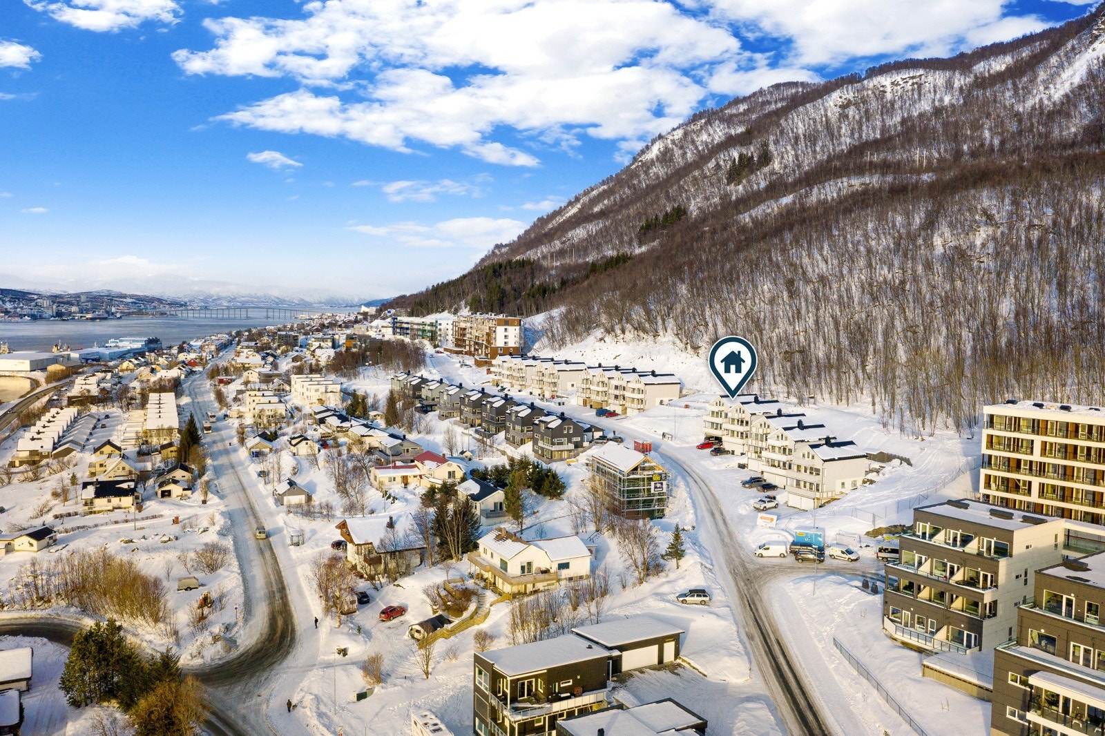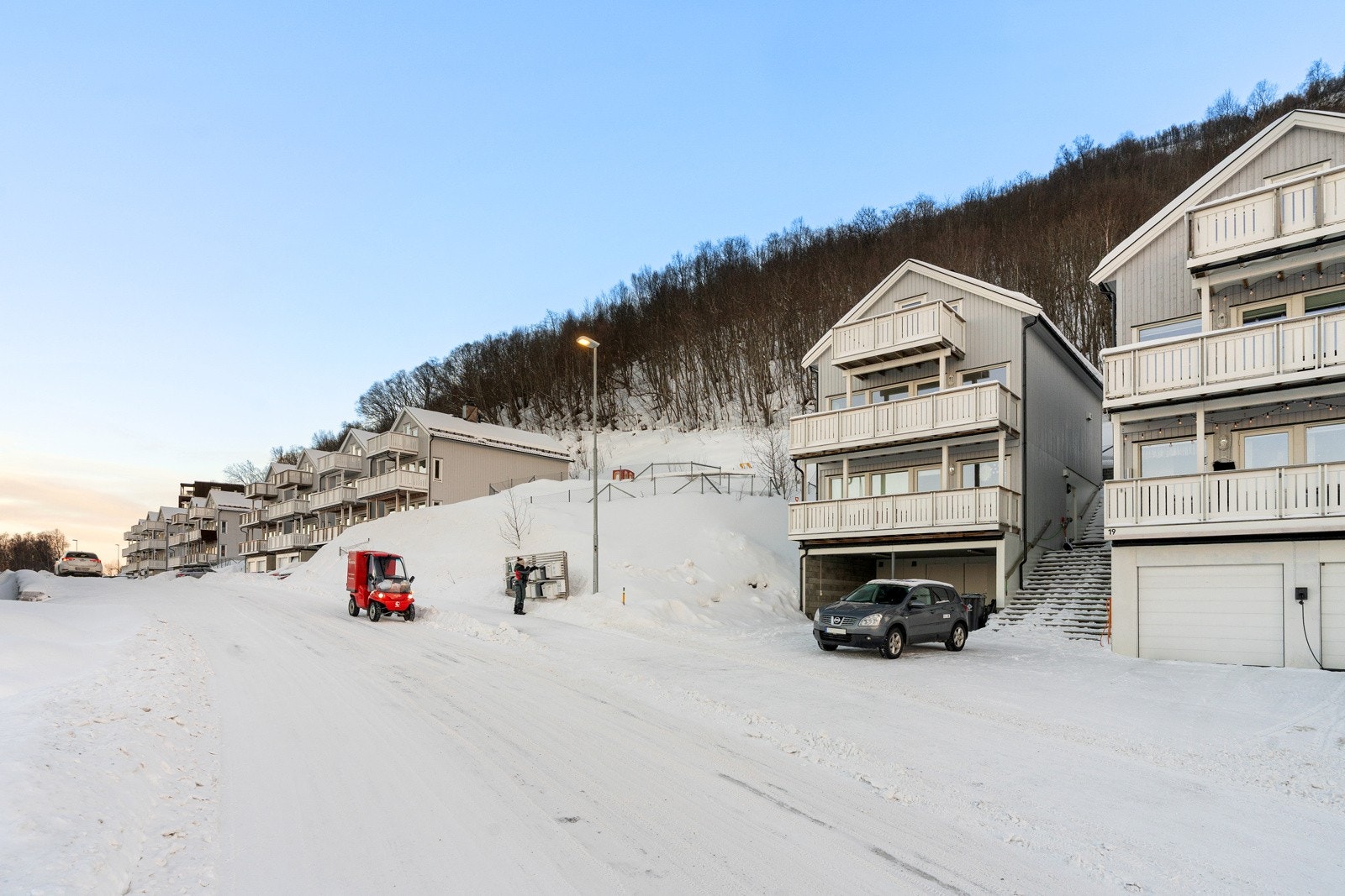 | Beliggenhet | Boligområde på midtre Kaldslett. Bebygget med frittliggende eneboliger og rekkehus/flermannsboliger. Det er gangavstand til skole og barnehage. Det er ca. 5 km til Tromsø sentrum, og det er kort veg til busstopp. Det er ca. 4 km til Tromsdalen, som har handelspark med diverse andre servicetjenester. Leiligheten har fin utsikt over deler av Tromsøya, Tromsøysundet, og innseilingen til Tromsø. |