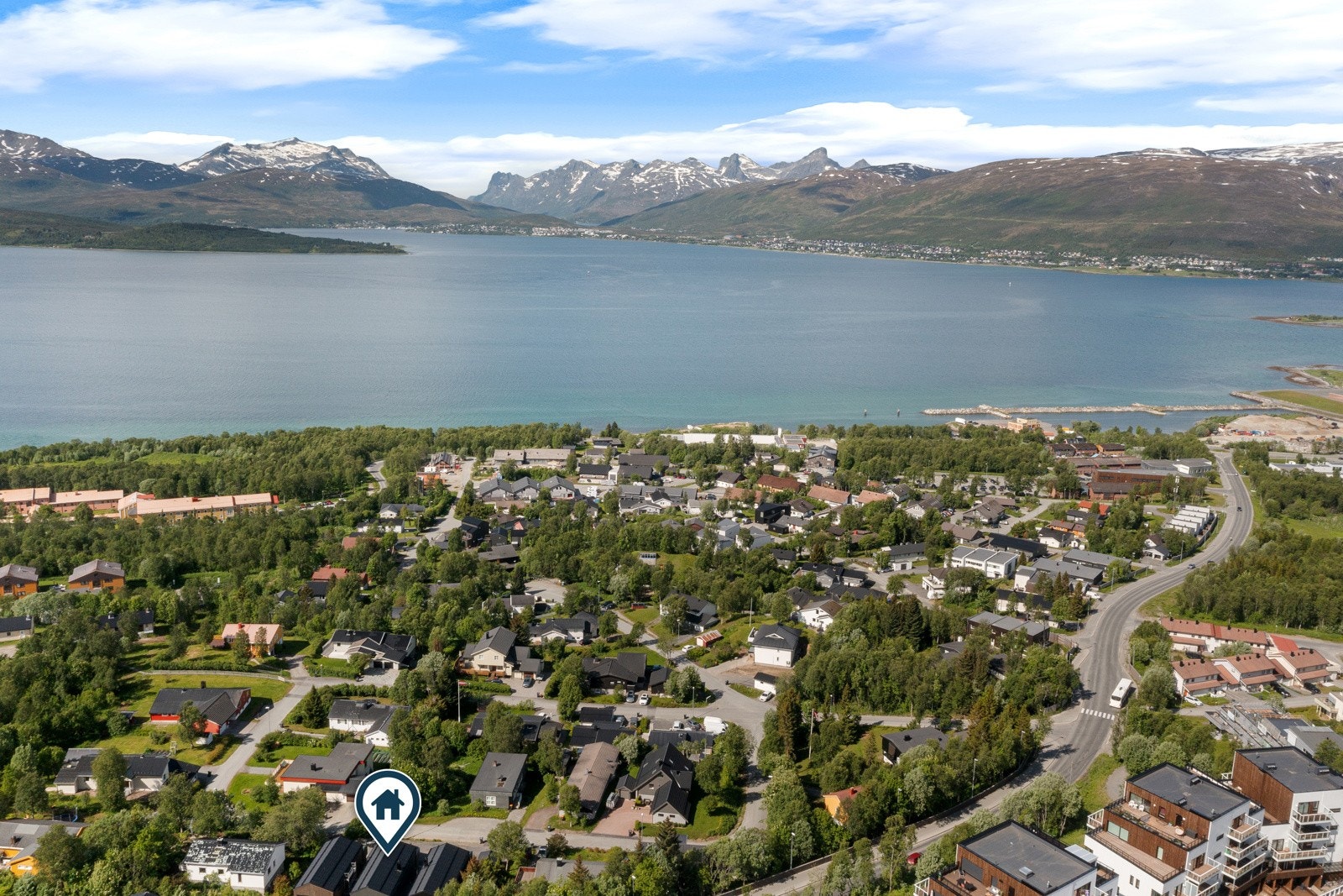 | Beliggenhet | Eiendommen ligger i et veletablert og attraktiv boligområde på vestsiden av Tromsøya. Fin beliggenhet i gate uten gjennomgangstrafikk. Gode sol- og utsiktsforhold. Umiddelbar nærhet til friområder i marka med turstier og lysløype. Barnehage og barneskole ligger i gangavstand fra boligen. |