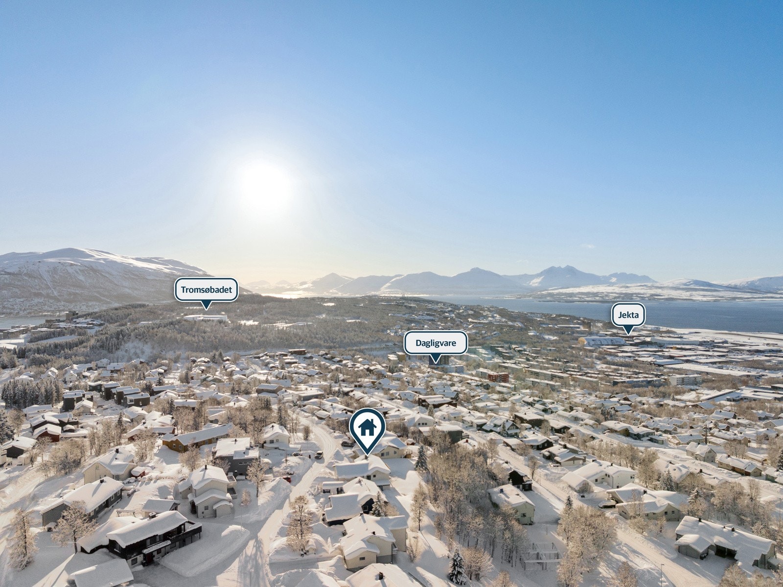 | Beliggenhet | Eiendommen ligger i et veletablert, barnevennlig og attraktivt boligområde i øvre del av Mortensnes. Gode sol- og lysforhold med noe sørvendt utsikt. Nærhet til skoler/barnehager, Tromsøbadet, lysløype og friområder i marka, samt gangavstand til UNN/UiT. Nærhet til bussholdeplass med hyppige avganger i retning Giæverbukta og sentrum. Øvrige avstander: Langnes handelspark: Ca. 2 km. UNN/UiT: Ca. 1 km. Sentrum: Ca. 5 km. |